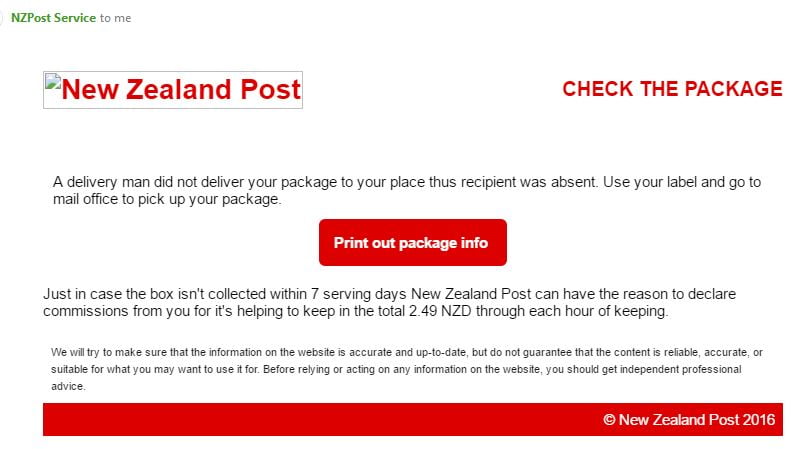 NZpostSecurity scams are big business these days. One such ‘phishing’ email very wide spread in New Zealand is made to look like it is from NZ Post and you have a parcel waiting.